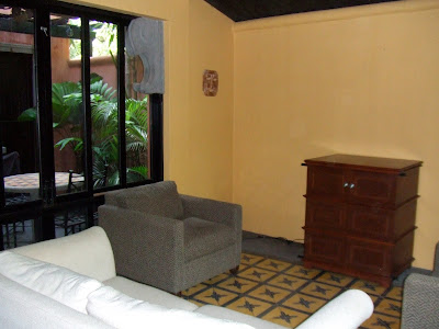 I found a great furniture store way out in the country down dirt roads. It took a while but well worth it. Check out the Ikat throws I used for the bed covering and the carving over the bed. In this room the walls were painting a softer cream. I would have liked to paint the trim but changing the black proved to be a real problem with time and the resources that were available to cover it up. There is only one hardware store and that's it no bondo, no regular paint brushes, no sealers, no black caulk, etc.