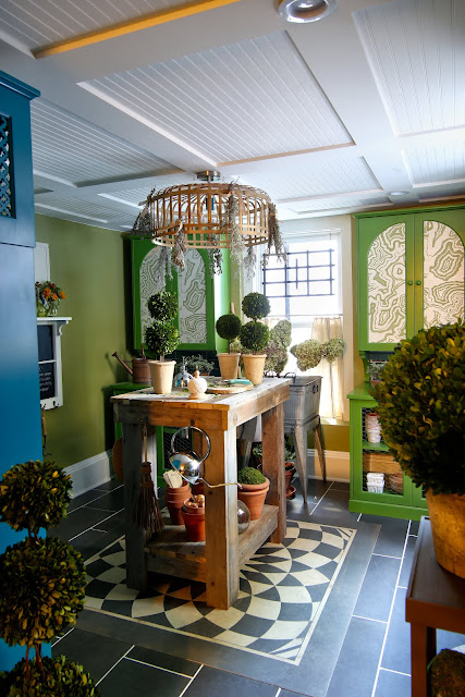 I also found the perfect English garden tools, white washed some terra cotta pots, clipped and dried some hydrangeas. What a perfect space for working on arrangements or drying bulbs. Even the floor was new with the tile from Crossville Tiles called Notrious was the perfect choice - dark with a large scale to make the room bigger and hide dirt.